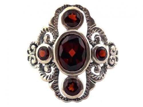 Inspired by antique styling, this ring shows off the red of it's Garnets, with Sterling Silver ornamental detailing.